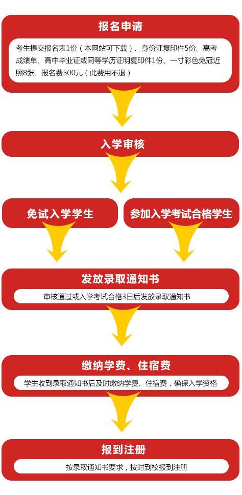 提交报名材料---缴纳相关费用---笔试(符合免试资格预约面试)---入学面试---发放录取通知书---开学